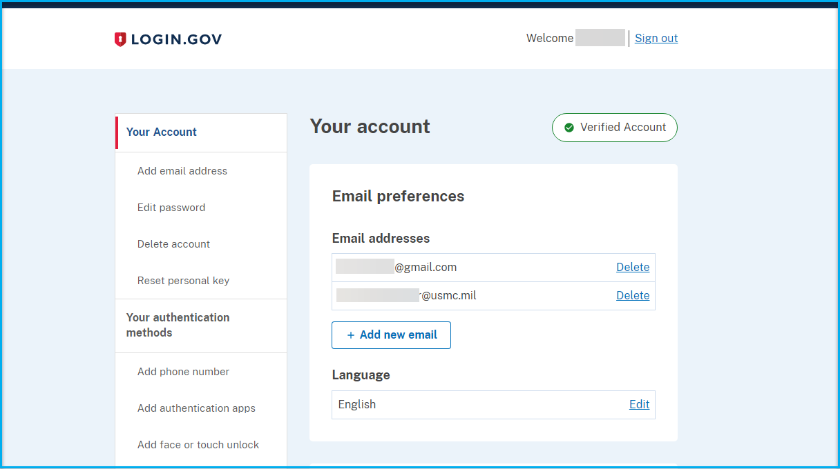 WHAT DOES IT MEAN? If they have a Login.gov account with their personal email address, they don't need to register again. The user will need to go to the Login.gov website and log in with their existing account so they can add their work email address that matches the Learning Academy account. Their Login.gov account details would then look like this: ![]() |
