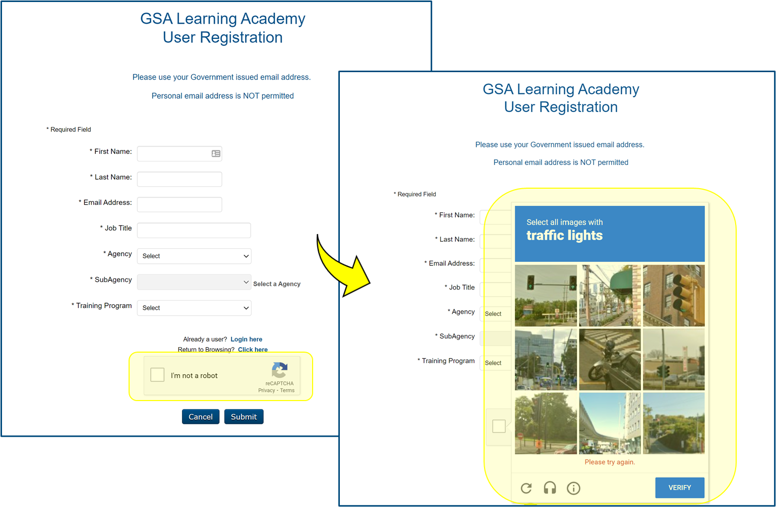 We are sorry to hear that you're experiencing issues with the CAPTCHA test during the registration process. The GSA Learning Academy Administrators have kindly advised that you may attempt using a different browser and/or connect to a different network.