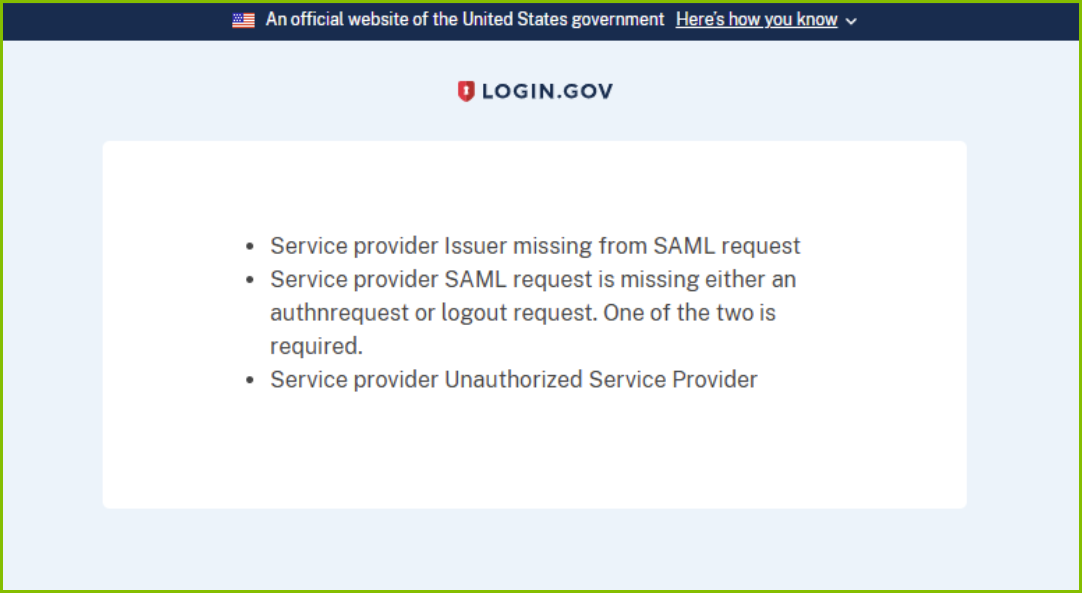 Kindly note that the SAML error is related to Login.gov’s authentication process, which is managed outside of our system.